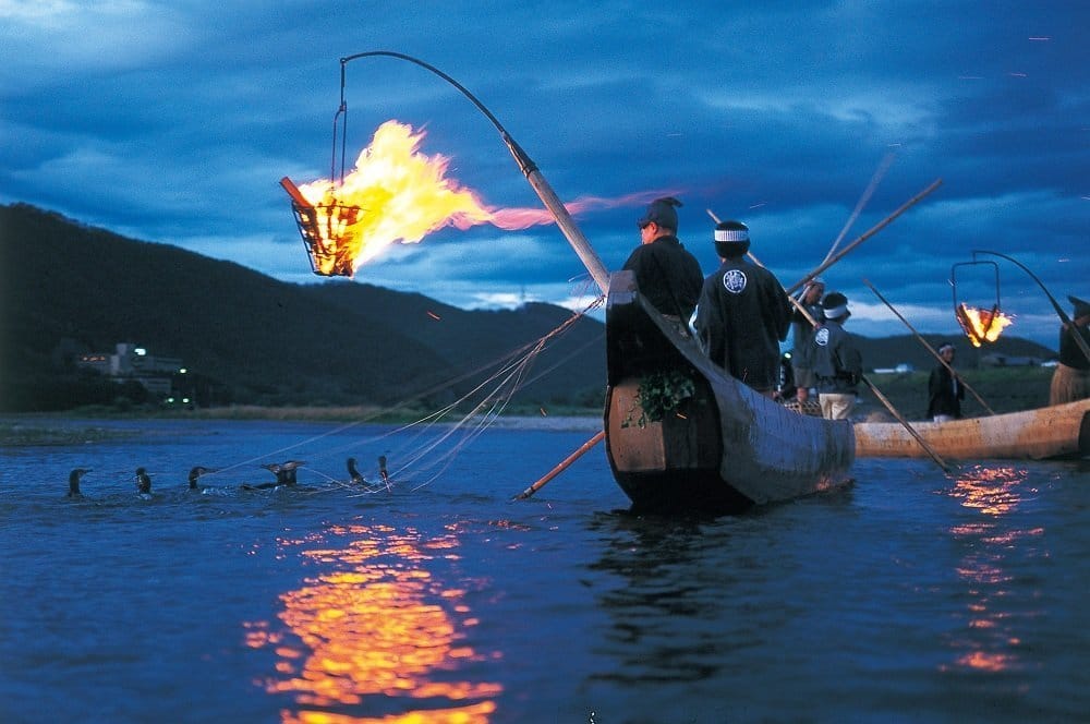 Seit mehr als tausend Jahren verwenden japanische Fischer dressierte Kormorane, um Flussfische zu fangen. Von langen Holzbooten aus führt jeder Fischer ein Dutzend Kormorane an der Leine und holt die von den Vögeln gefangenen Fische aus ihren Kehlsäcken. Nachts werden große Feuer am Bug der Boote entfacht, die Licht zum Arbeiten spenden und ein stimmungsvolles Schauspiel für Gäste sind, die vom Wasser aus zuschauen.